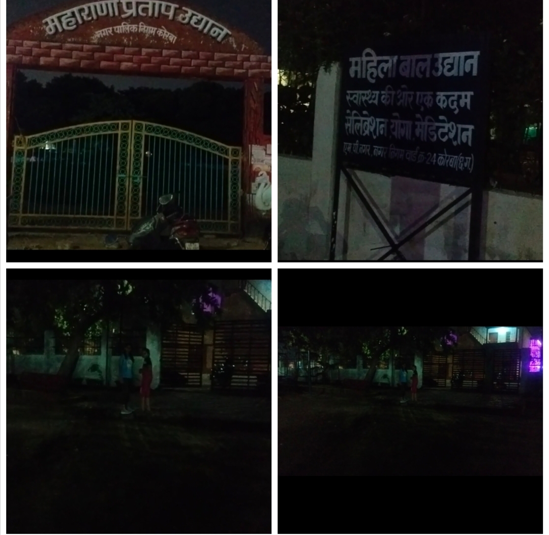 Samachar Chhattisgarh Korba.कोरबा। शहर में नगर निगम के द्वारा लाखों रुपये खर्च कर सुंदर उद्यान तो बना दिए गए हैं, लेकिन उनके रखरखाव की स्थिति बेहद खराब है। महाराणा प्रताप नगर उद्यान और महिला बाल उद्यान में अंधेरा छाया रहने से लोग शाम के समय सैर करने में असहज महसूस कर रहे हैं।
