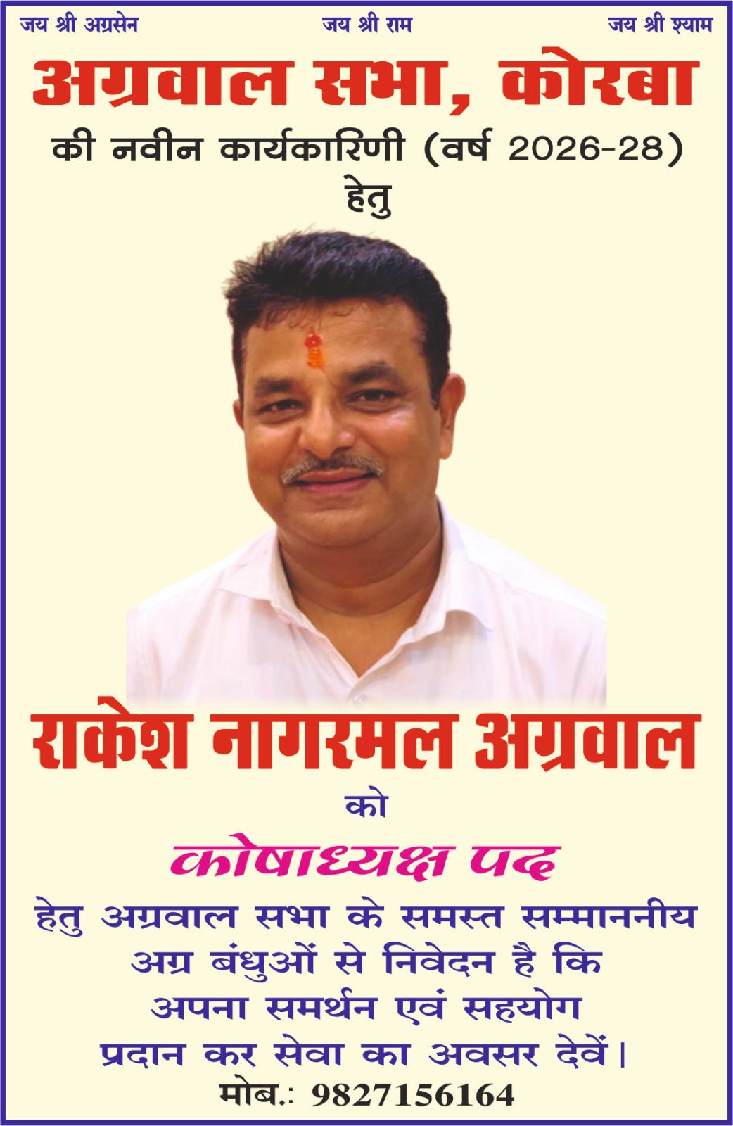 अग्रवाल सभा कोरबा चुनाव 2026-28,कोषाध्यक्ष पद हेतु राकेश नागरमल के समर्थन में अपील