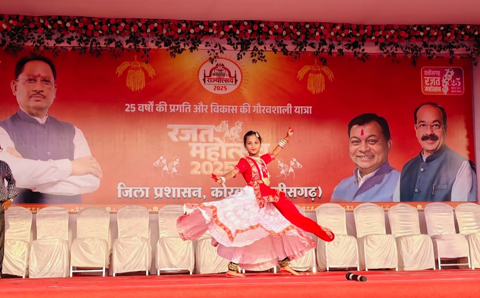 Samachar Chhattisgarh Korba.कोरबा। छत्तीसगढ़ राज्य के रजत जयंती वर्ष के अवसर पर आयोजित राज्योत्सव 2025 में कोरबा जिले की प्रतिभाशाली बाल कलाकार अर्शिका आर्या ने अपने मनमोहक कथक नृत्य से दर्शकों को मंत्रमुग्ध कर दिया। जिला मुख्यालय में 2 नवंबर से 5 नवंबर तक चल रहे इस राज्य महोत्सव में प्रदेशभर से कलाकारों ने अपनी प्रस्तुतियों के माध्यम से छत्तीसगढ़ की समृद्ध कला, संस्कृति और लोक परंपराओं का सुंदर प्रदर्शन किया। इन्हीं में से एक आकर्षण रही कक्षा चौथी की नन्ही कलाकार अर्शिका आर्या की प्रस्तुति, जिसने मंच पर उपस्थित दर्शकों के हृदय को छू लिया।