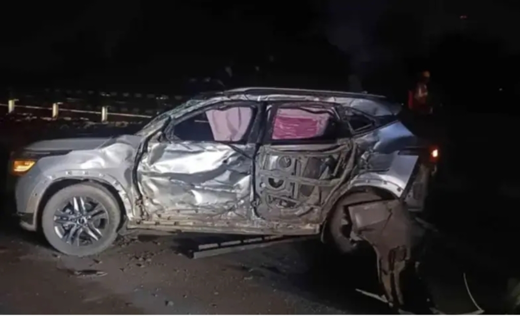 उर्गा पताडी ओवर ब्रिज में एक हाईवा ने कार को मारी जब्त टकर जिससे कार के पर खर्च उड़ गए हाईवे चालक मौके से फरार