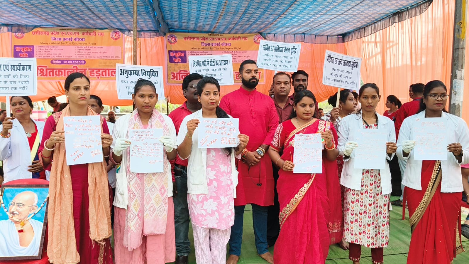 Samachar Chhattisgarh Korba.छत्तीसगढ़ प्रदेश राष्ट्रीय स्वास्थ्य मिशन एनएचएम कर्मचारी संघ ने अपनी 10 सूत्री मांगों को लेकर घंटाघर चौक पर एकजुट होकर अनिश्चितकालीन हड़ताल पर चले गए हैं एनएचएम कर्मचारी संघ के कोसा अध्यक्ष अनीश शर्मा ने मीडिया से चर्चा करते हुए बताया कि पिछले तीन दिनों से अपनी मांगों को धरना प्रदर्शन किया जा रहा है हमारी प्रमुख मांगे हैं निमित्तिकरण, वेतन विसगतियां को दूर करना, संविदा कर्मचारियों को स्थाई कर्मचारियों के समान सुविधा देना उन्होंने बताया कि सरकार द्वारा हमारी हर बार अनदेखी की जा रही है हर्षिता ताम्रकार जिला अध्यक्ष ने बताया कि कोरोना कॉल महामारी के दौरान अपनी जान की परवाह न करें बिना दिन रात हम मरीज की सेवा में लगे हुए थे लेकिन उसके बाद भी सरकार द्वारा हमारी बातें नहीं सुनी जा रही है जिसे देखते हुए कर्मचारियों को अनोखा प्रदर्शन मुख्यमंत्री और स्वास्थ्य मंत्री को ध्यान आकर्षित करने के लिए तीसरे दिन कर्मचारियों ने एक जुटा दिखाते हुए अपने खून से मुख्यमंत्री और स्वास्थ्य मंत्री के नाम पर पत्र लिखा