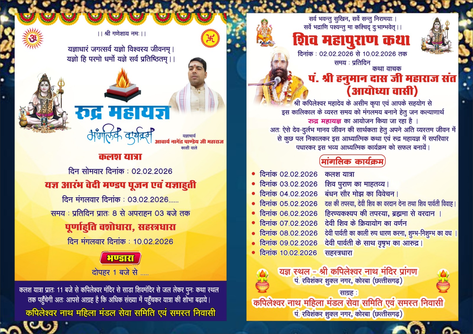 Samachar Chhattisgarh Korba.कोरबा पं. रविशंकर शुक्ल नगर, कोरबा स्थित श्री कपिलेश्वर नाथ मंदिर प्रांगण में जनकल्याणार्थ रुद्र महायज्ञ एवं शिव महापुराण कथा का भव्य आयोजन किया जा रहा है। यह धार्मिक आयोजन 02 फरवरी 2026 से 10 फरवरी 2026 तक प्रतिदिन प्रातः 8 बजे से दोपहर 3 बजे तक संपन्न होगा।