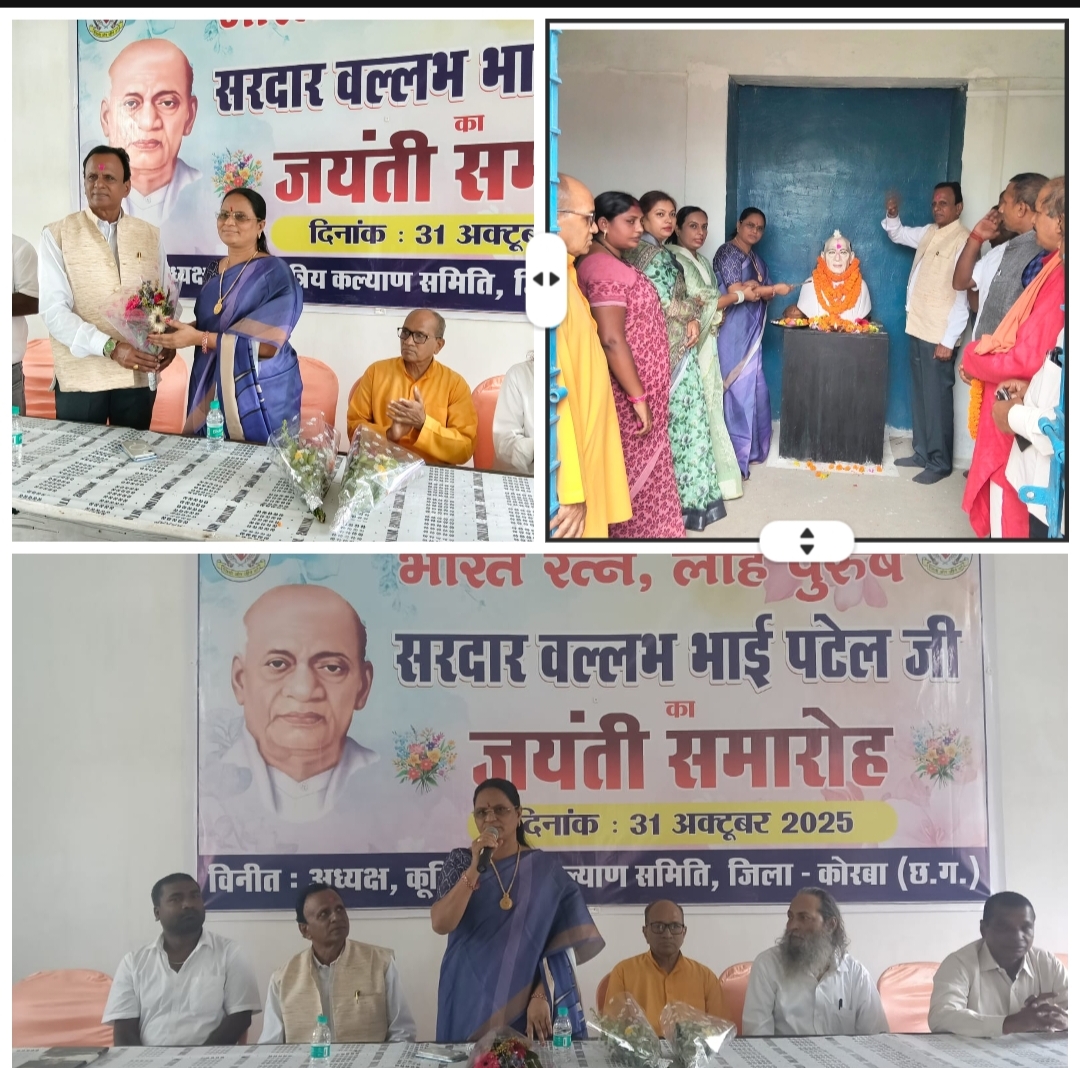 कोरबा 31 अक्टूबर 2025. भारत रत्न और लौह पुरुष सरदार वल्लभभाई पटेल की जयंती के अवसर पर कुर्मी क्षत्रिय कल्याण समिति, जिला कोरबा की ओर से कुर्मी समाज भवन में भव्य समारोह का आयोजन किया गया। समारोह में समाज के सैकड़ों सदस्य, नगर के गणमान्य नागरिक और विभिन्न सामाजिक संगठनों के प्रतिनिधि बड़ी संख्या में उपस्थित रहे।