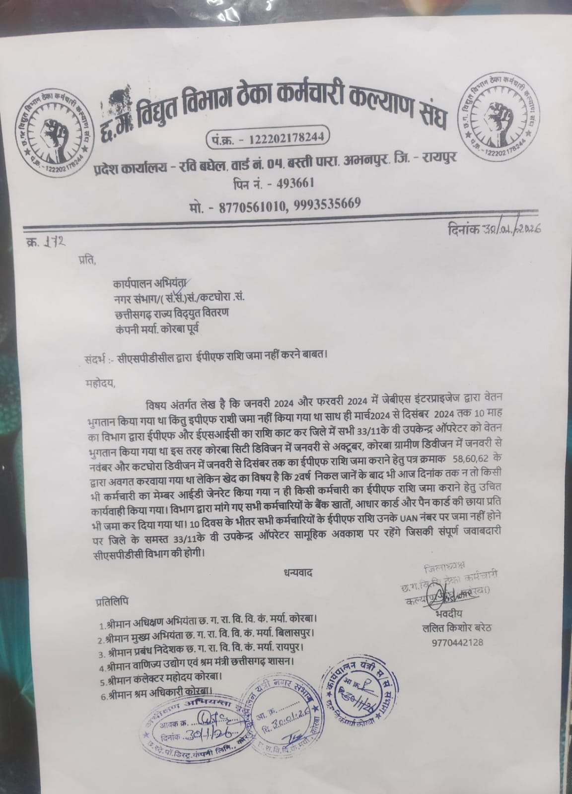 Samachar Chhattisgarh.कोरबा: विद्युत विभाग ठेका कर्मचारी कल्याण संघ ने जिले के 33/11 केवी उपकेन्द्र ऑपरेटरों की ईपीएफ राशि न जमा किए जाने पर गंभीर नाराजगी जताई है। जनवरी 2024 और फरवरी 2024 में जेबीएस इंटरप्राइजेज द्वारा वेतन का भुगतान किए जाने के बावजूद कर्मचारियों की ईपीएफ राशि अब तक जमा नहीं हुई है।