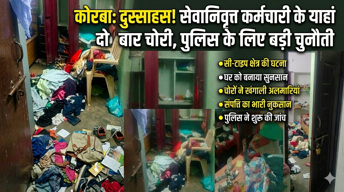 लोक प्लस न्यूज़ : कोरबा। सिविल लाइन थाना क्षेत्र के सीएसईबी कॉलोनी में रिटायर्ड एएसआई गलेटबिन कुमार के घर दूसरी बार चोरी की वारदात हुई। घटना तब हुई जब वे बेटे की बारात लेकर बालको स्थित साईं मंगलम भवन गए थे। बुधवार सुबह पड़ोसियों की सूचना पर पुलिस मौके पर पहुंची। घर में नगदी, लैपटॉप, कंप्यूटर, टीवी सहित कीमती सामान रखा था, जिसकी पूरी जानकारी उनके लौटने के बाद ही हो पाएगी। उल्लेखनीय है कि जनवरी में भी इसी घर में लाखों की चोरी हुई थी, लेकिन अब तक कोई आरोपी नहीं पकड़ा गया। दोबारा वारदात से पुलिस व्यवस्था पर सवाल उठ रहे हैं। फिलहाल पुलिस मामले की जांच में जुटी हुई है।
