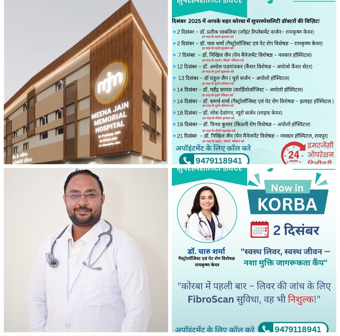 Samachar Chhattisgarh Korba.कोरबा के मरीजों के लिए राहत भरी खबर है। एम.जे.एम. हॉस्पिटल ने दिसंबर 2025 में कई सुपरस्पेशलिटी डॉक्टरों की नियमित विज़िट का शेड्यूल जारी किया है। इसके साथ ही 2 दिसंबर को कोरबा में पहली बार लिवर की जांच के लिए निःशुल्क FibroScan सुविधा भी शुरू की जा रही है। यह तकनीक लिवर की स्थिति जानने के लिए आधुनिक और सुरक्षित पद्धति मानी जाती है।
