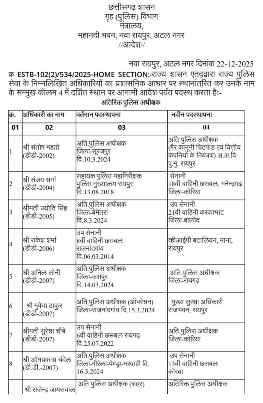 Samachar Chhattisgarh Korba.छत्तीसगढ़ शासन के गृह (पुलिस) विभाग द्वारा राज्य पुलिस सेवा के अधिकारियों की व्यापक तबादला सूची जारी की गई है। इस आदेश के तहत कुल 95 अधिकारियों का स्थानांतरण किया गया है, जिसमें 35 एडिशनल एसपी व उप सेनानी रैंक तथा 60 डीएसपी रैंक के अधिकारी शामिल हैं। इस बड़े प्रशासनिक फेरबदल का असर कोरबा जिले पर भी स्पष्ट रूप से देखने को मिला है