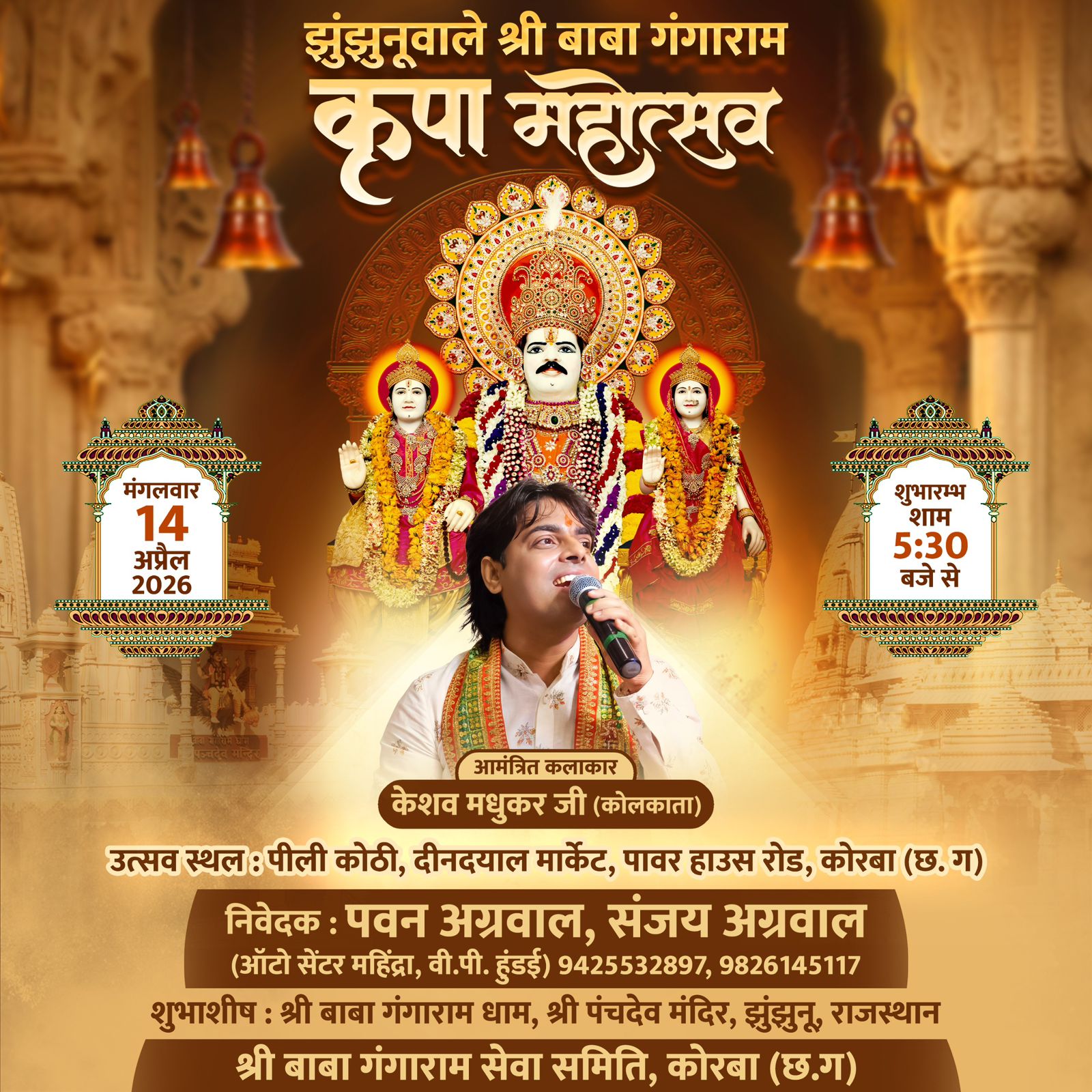 लोक प्लस न्यूज़ : कोरबा। शहर में धार्मिक आस्था और भक्ति का अनूठा संगम देखने को मिलेगा, जहां झुंझुनूंवाले श्री बाबा गंगाराम कृपा महोत्सव का आयोजन 14 अप्रैल 2026, मंगलवार को किया जा रहा है। इस भव्य धार्मिक आयोजन में श्रद्धालुओं के लिए भक्ति, आशीर्वाद और आध्यात्मिक वातावरण का विशेष अवसर रहेगा।