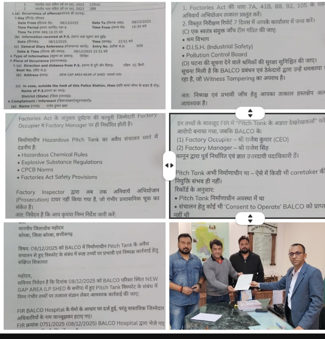 08 दिसम्बर 2025 को BALCO के NEW GAP AREA में निर्माणाधीन Pitch Tank में हुए विस्फोट ने प्रबंधन की गंभीर लापरवाही को उजागर किया है। FIR BALCO Hospital के मेमो पर दर्ज हुई, परंतु वास्तविक जिम्मेदार BALCO के Factory Occupier (CEO राजेश कुमार) और Factory Manager (राजेश सिंह) के नाम जानबूझकर FIR से हटा दिए गए। निर्माणाधीन टैंक को अवैध रूप से Coal Tar Pitch से भरा जा रहा था और ऊपर वेल्डिंग भी कराई जा रही थी—जो Explosive एवं Safety Norms का सीधा उल्लंघन है।