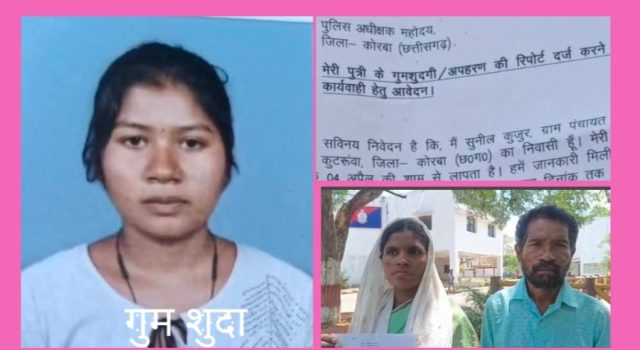 प्राप्त जानकारी के अनुसार ग्राम पंचायत अरसेना के आश्रित ग्राम कुटेलवा निवासी सुनील कुजूर ने पुलिस अधीक्षक को दिए आवेदन में बताया कि उनकी पुत्री संध्या कुजूर 4 अप्रैल से लापता है परिजनों को जानकारी मिली है कि वह गांव के ही एक युवक के साथ गई है लेकिन अब तक उसका कोई पता नहीं चल पाया है और न ही किसी प्रकार का संपर्क हो सका है