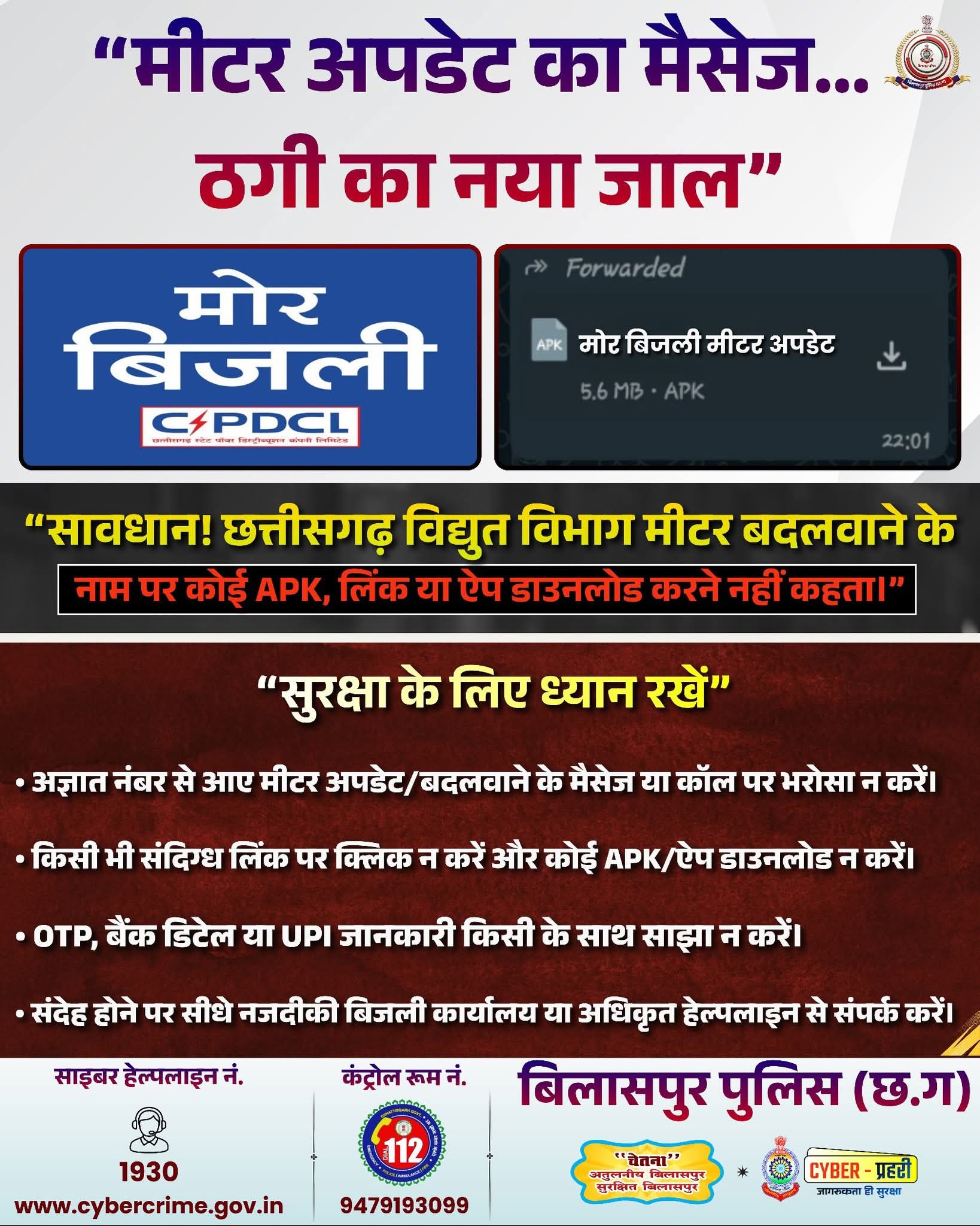 बिलासपुर पुलिस और बिजली विभाग ने स्पष्ट किया है कि छत्तीसगढ़ विद्युत विभाग कभी भी मीटर अपडेट या बदलवाने के नाम पर किसी उपभोक्ता को लिंक, APK या ऐप डाउनलोड करने के लिए नहीं कहता। ऐसे सभी संदेश साइबर अपराध का हिस्सा हो सकते हैं।