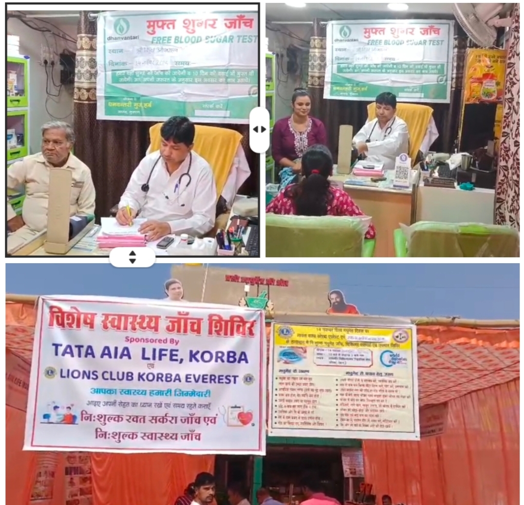 Samachar Chhattisgarh Korba.विश्व मधुमेह दिवस के अवसर पर लायंस क्लब कोरबा एवरेस्ट एवं टाटा AIA लाइफ कोरबा के संयुक्त तत्वाधान में पतंजलि चिकित्सालय, शिव औषधालय, महानदी कॉम्प्लेक्स निहारिका रोड में एक भव्य निःशुल्क चिकित्सा शिविर का आयोजन किया गया
