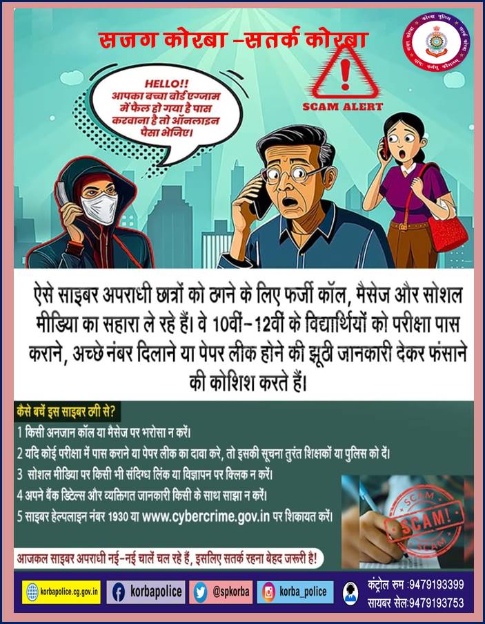Samachar Chhattisgarh : कोरबा पुलिस आमजन, विशेषकर 10वीं एवं 12वीं कक्षा के विद्यार्थियों एवं उनके पालकों से अपील करती है कि वे ‘परीक्षा में पास कराने’ या ‘अंक बढ़वाने’ के नाम पर आने वाले किसी भी अज्ञात कॉल, मैसेज या ईमेल से सावधान रहें। हाल ही में यह देखा गया है कि परीक्षा परिणाम की प्रतीक्षा में मानसिक तनाव से जूझ रहे छात्रों एवं उनके पालकों को निशाना बनाकर कुछ साइबर अपराधी खुद को शिक्षा बोर्ड या स्कूल प्रबंधन का अधिकारी बताकर ठगी का प्रयास कर रहे हैं।