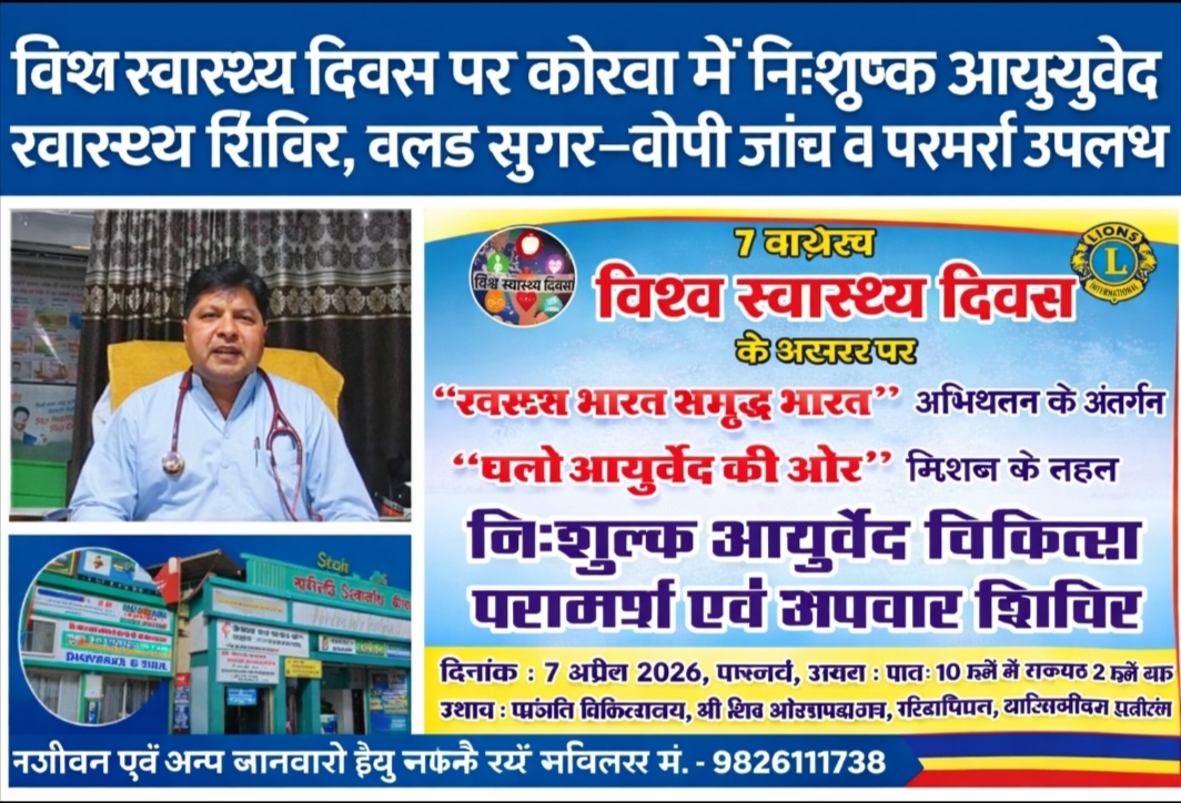 लोक पल्स न्यूज़ : कोरबा। 7 अप्रैल विश्व स्वास्थ्य दिवस के अवसर पर इस वर्ष की थीम “स्वास्थ्य के लिए एक साथ, विज्ञान के साथ खड़े रहें” के तहत “चलो आयुर्वेद की ओर” मिशन अंतर्गत एक विशेष नि:शुल्क स्वास्थ्य शिविर का आयोजन किया जा रहा है। यह शिविर लायंस क्लब कोरबा एवरेस्ट एवं आयुष मेडिकल एसोसिएशन के संयुक्त तत्वावधान में 7 अप्रैल 2026 (मंगलवार) को पतंजलि चिकित्सालय, श्री शिव औषधालय, निहारिका में प्रातः 10 बजे से दोपहर 2 बजे तक आयोजित होगा।